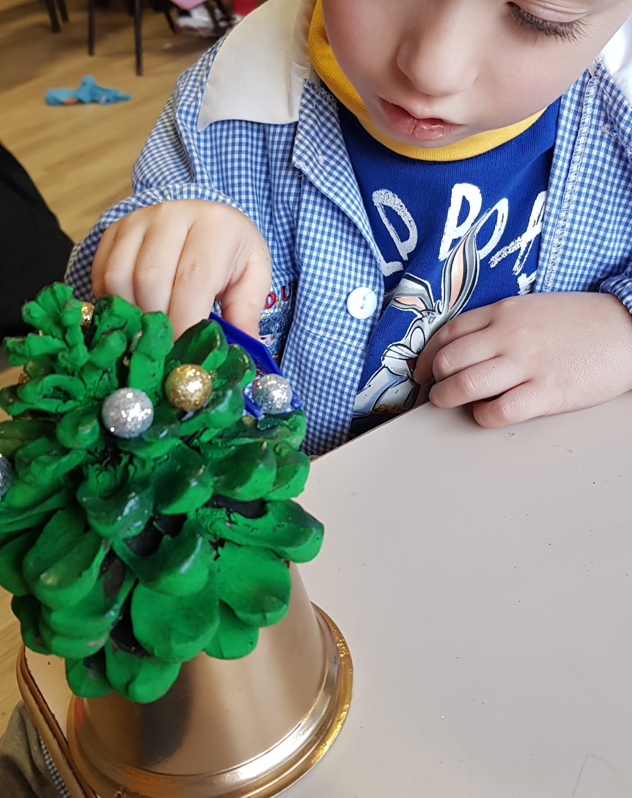 Prima i bambini hanno colorato la grande pigna poi con una pinzetta hanno posizionato le palline