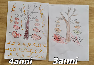 I 3 anni colorano semplicemente e i 4 riempiono le foglie col linee di pregrafismo